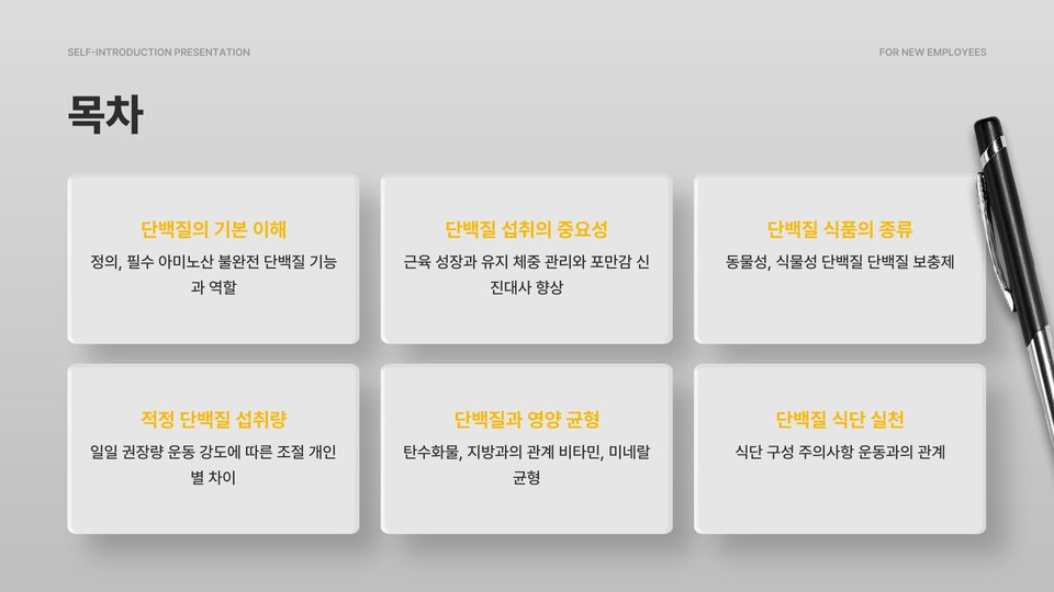 단백질 식단의 주요 구성 요소는 다음과 같습니다: