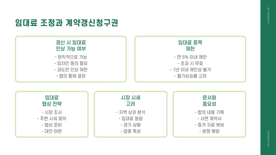 상가 계약갱신청구권은 상가 임대차 관계에서 매우 중요한 요소입니다. 이는 임대인이 임대차 계약이 종료되었을 때, 임차인이 계약을 갱신할 수 있는 권리를 의미합니다. 이를 통해 임차인은 안정적인 사업 운영을 지속할 수 있으며, 임대인은 장기적으로 안정적인 수익을 확보할 수 있습니다. 이러한 계약갱신청구권은 상가 임대차 계약에 있어 매우 중요한 법적 보호 장치입니다.