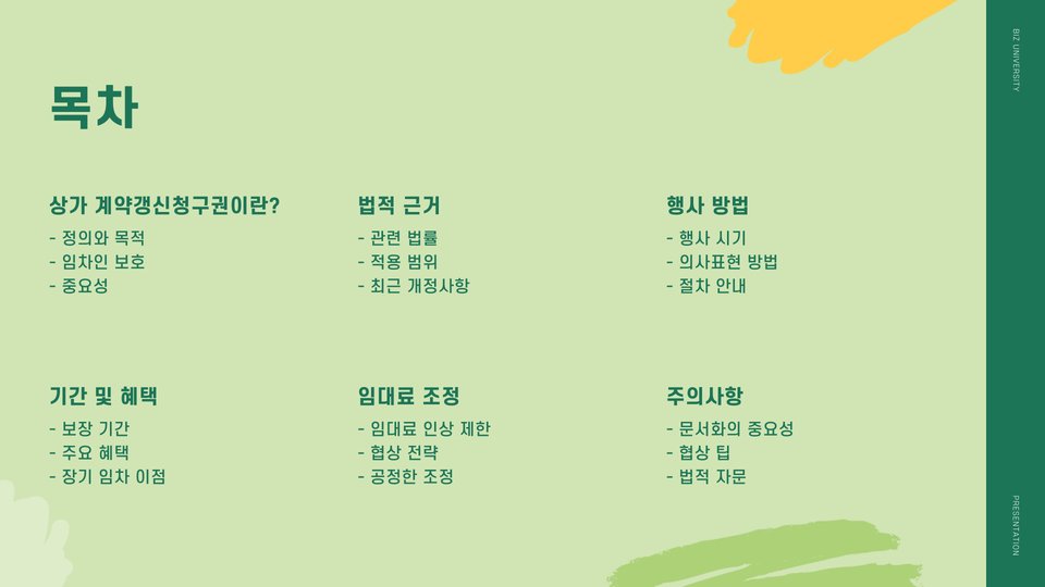 상가 계약갱신청구권은 상가 임대차 보증법에 인해 부여된 권리로, 임차자는 계약 기간 종료 후에도 상가의 임대차 계약을 연장할 수 있는 권리를 가집니다. 이는 상가 운영자에게 안정성을 제공합니다. 예를 들어, 상가 운영자가 많은 시간을 들여 만들어 놓은 고객 관계와 매장 인테리어를 잃지 않도록 보장해주는 제도입니다. 계약 갱신을 요청하지 않으면, 임차인은 새로운 임대 조건 또는 관리자의 마음에 따라 계약을 잃을 수 있습니다.