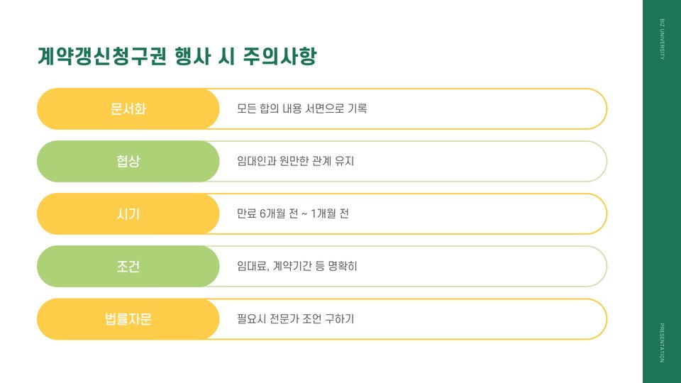 | 법적 절차 준수 | 계약갱신청구권 행사 시 법적 절차를 따라야 함 |