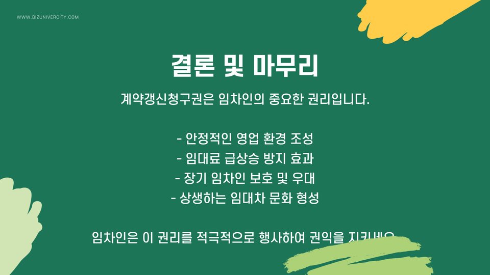상가 계약갱신청구권은 임차인과 임대인 모두에게 중요한 법적 보호 장치입니다. 이를 통해 임차인은 안정적인 사업 운영을 이어갈 수 있으며, 임대인은 장기적인 수익을 확보할 수 있습니다. 계약갱신청구권의 이해와 활용은 상가 임대차 계약에서 매우 중요한 부분이므로, 항상 주의 깊게 접근해야 합니다. 정확한 정보와 전문가의 도움을 통해 권리를 효과적으로 행사하는 것이 중요합니다.