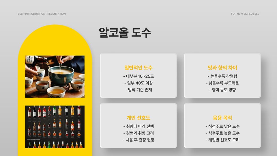 따라서, 음주 경험이 부족한 분들은 낮은 도수의 전통주부터 시도해 보기를 권장합니다. 점차적으로 자신에게 맞는 도수를 찾는 과정이 필요합니다.