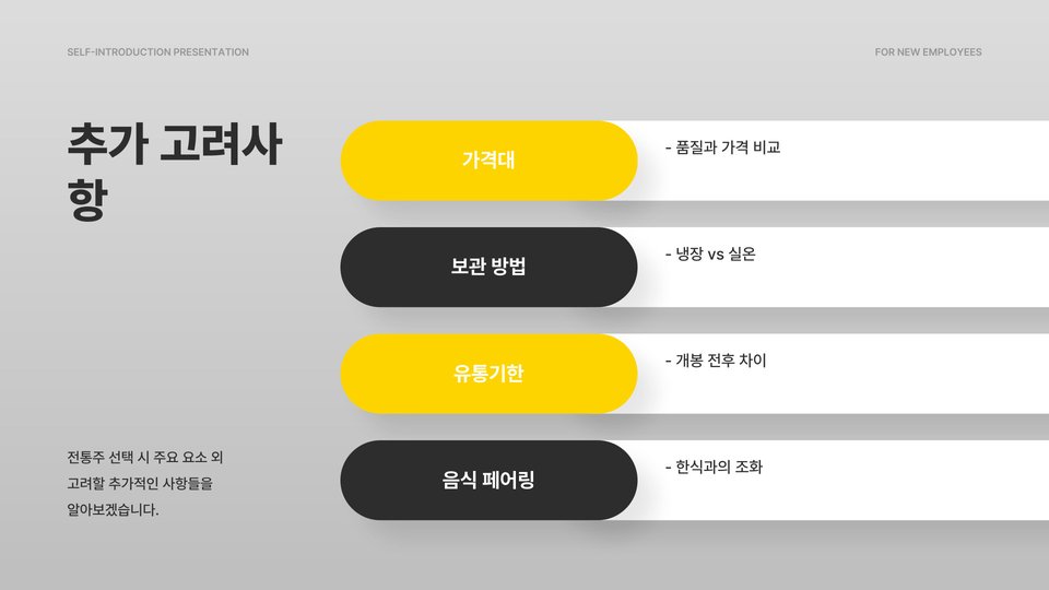 마지막으로, 개인의 기호에 따라 테이스팅을 통해 여러 가지 제품을 시도해 보는 것도 좋은 방법입니다. 그 과정에서 자신만의 취향을 발견하게 되고, 다양한 전통주를 경험할 수 있습니다.