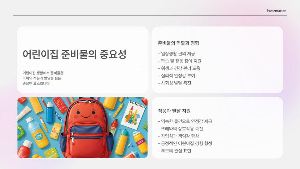 어린이집 준비는 아이의 첫 사회 경험을 위한 중요한 과정입니다. 부모님이 준비물을 잘 챙겨주고, 아이와 함께하는 시간을 가지면 더 나은 어린이집 생활을 시작할 수 있습니다. 아이의 행복한 어린이집 생활을 위해 준비물을 잘 챙겨주세요!
