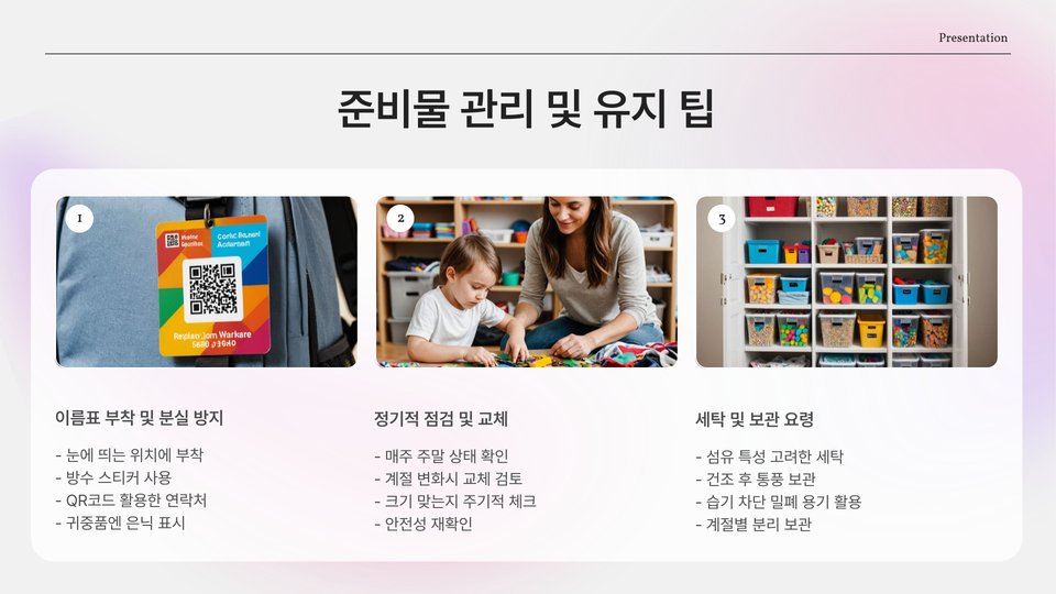 마지막으로, 준비물을 포장하고 정리하는 과정에서도 아이와 함께하는 것이 좋습니다. 각 물품의 사용법이나 보관 방법을 아이에게 설명해 주며, 스스로 정리하는 법을 배우도록 도와주세요. 이렇게 하면 아이는 자연스럽게 책임감과 조직력을 기를 수 있습니다.