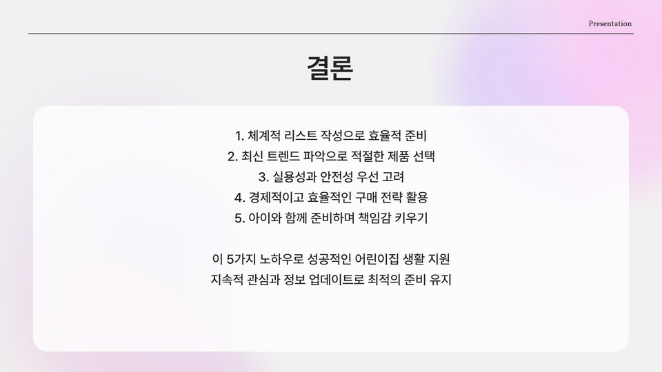 이렇게 다섯 가지 방법으로 어린이집 준비물을 성공적으로 챙기는 방법을 소개했습니다. 어린이집 준비물은 부모의 사랑과 관심이 담긴 중요한 아이템입니다. 아이의 첫 어린이집 환경이 긍정적이고 행복한 기억으로 남게 되길 바랍니다. 부모님들이 이 팁들을 활용하여 성공적인 준비가 이루어지길 기대합니다!