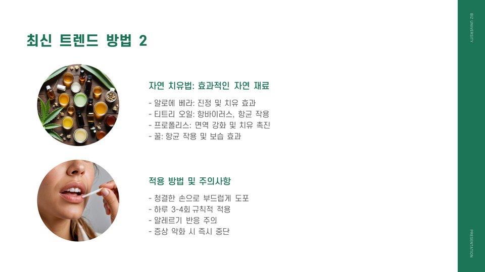 자연 요법은 부작용이 적고 쉽게 접근할 수 있는 옵션으로 많은 사람들에게 인기가 있습니다. 특히, 알로에 베라 젤은 입술 옆 수포에 매우 효과적입니다. 이 젤은 항염증 효과가 뛰어나고, 피부 재생을 촉진시키는 성분이 풍부하게 함유되어 있습니다. 알로에 베라 젤을 하루에 여러 번 affected area에 발라주면 지속적으로 수분을 공급할 수 있습니다.