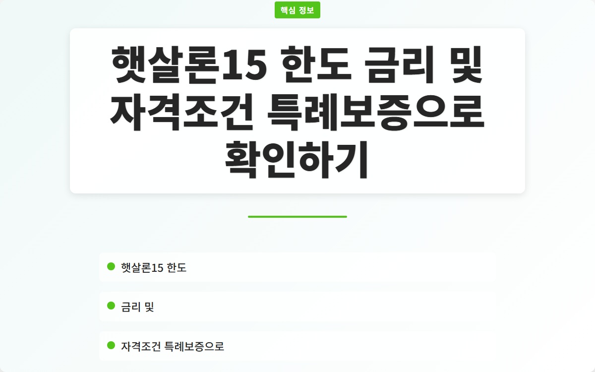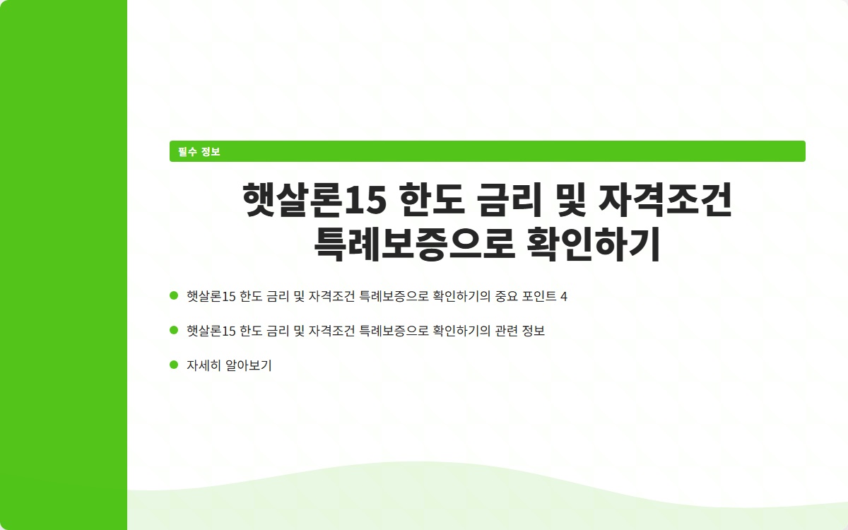 햇살론15는 저신용자 및 저소득자를 위한 금융 지원 프로그램으로, 많은 사람들이 이 프로그램에 대한 정보와 자격 조건, 한도 및 금리에 대한 궁금증을 가지고 있습니다. 이 글에서는 햇살론15의 직접보증과 관련된 주요 사항들을 자세히 살펴보겠습니다. 햇살론15의 혜택을 최대한 활용하기 위해 필요한 정보들을 알아보며, 올바른 결정을 내리는 데 도움을 드리고자 합니다.
