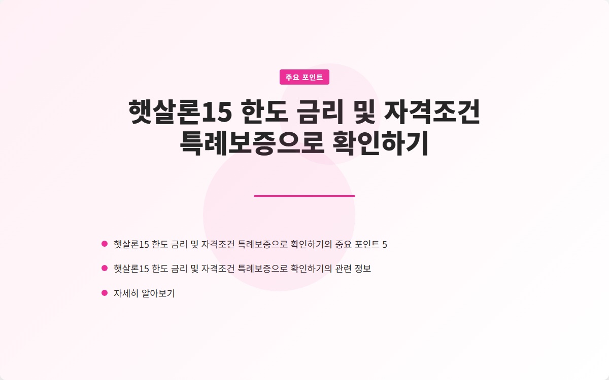 결론적으로, 햇살론15는 저소득층과 신용 불량자에게 실질적인 금융 지원을 제공하는 중요한 대출 프로그램입니다. 대출 한도와 금리, 그리고 자격 조건을 잘 이해하고 준비하여 재정적 안정성을 확보하는 것이 무엇보다 중요합니다. 특히, 특례보증의 이점을 최대한 활용하여 필요한 금액을 지원받는 것이 좋습니다. 지금 바로 자신의 조건을 점검하고, 서류를 준비해보세요.