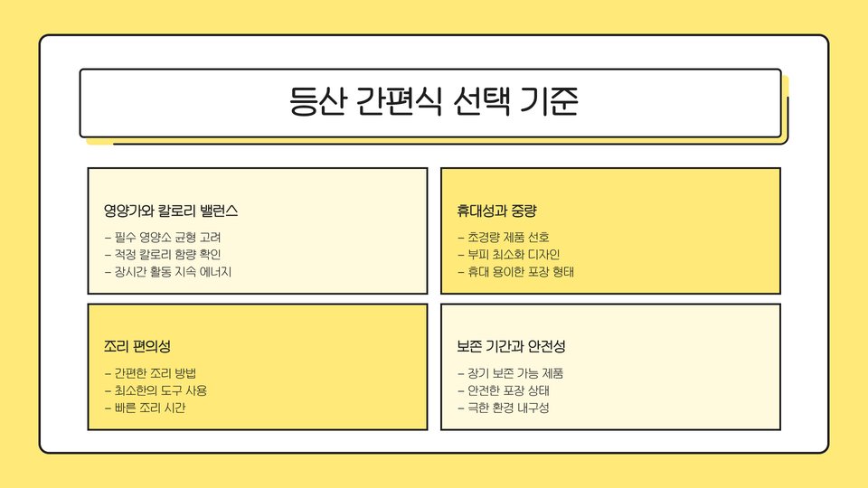- 산행 계획에 맞춰 적절한 간편식 선택이 중요.