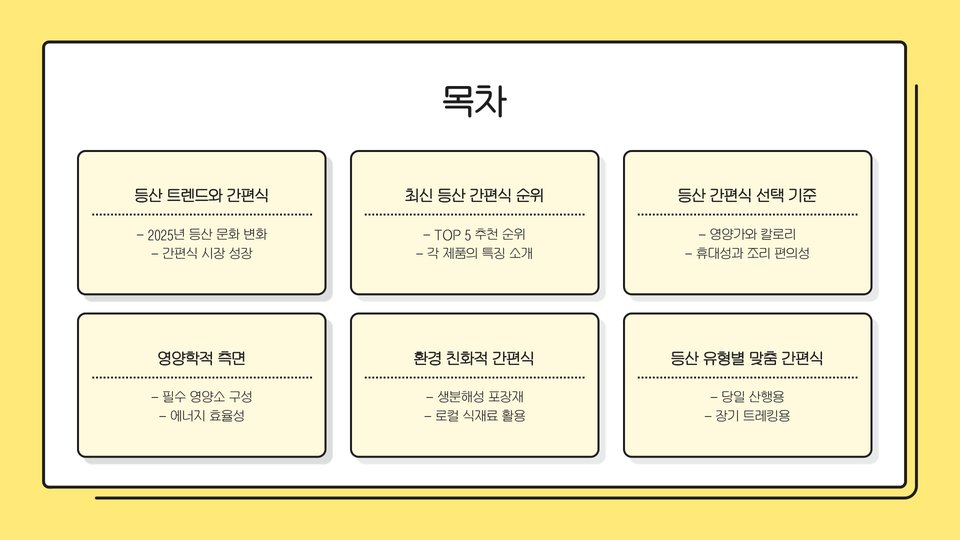 모든 정보를 종합하여 본인의 등산 스타일에 맞는 간편식을 찾아 새로운 등산의 즐거움을 느껴보세요.
