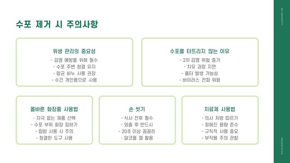 - 적절한 사후 관리 필요