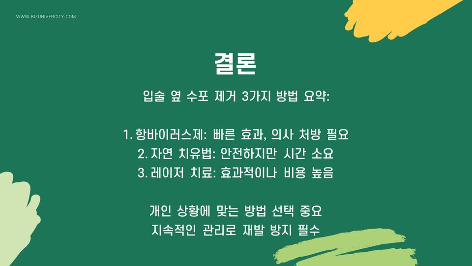 이번 포스트에서는 입술 옆 수포를 제거하는 세 가지 최신 방법에 대해 다루었습니다. 자연 요법, 의약품, 올바른 생활습관을 통해 여러분의 피부 건강을 지키고, 입술 수포를 효과적으로 관리해보세요.